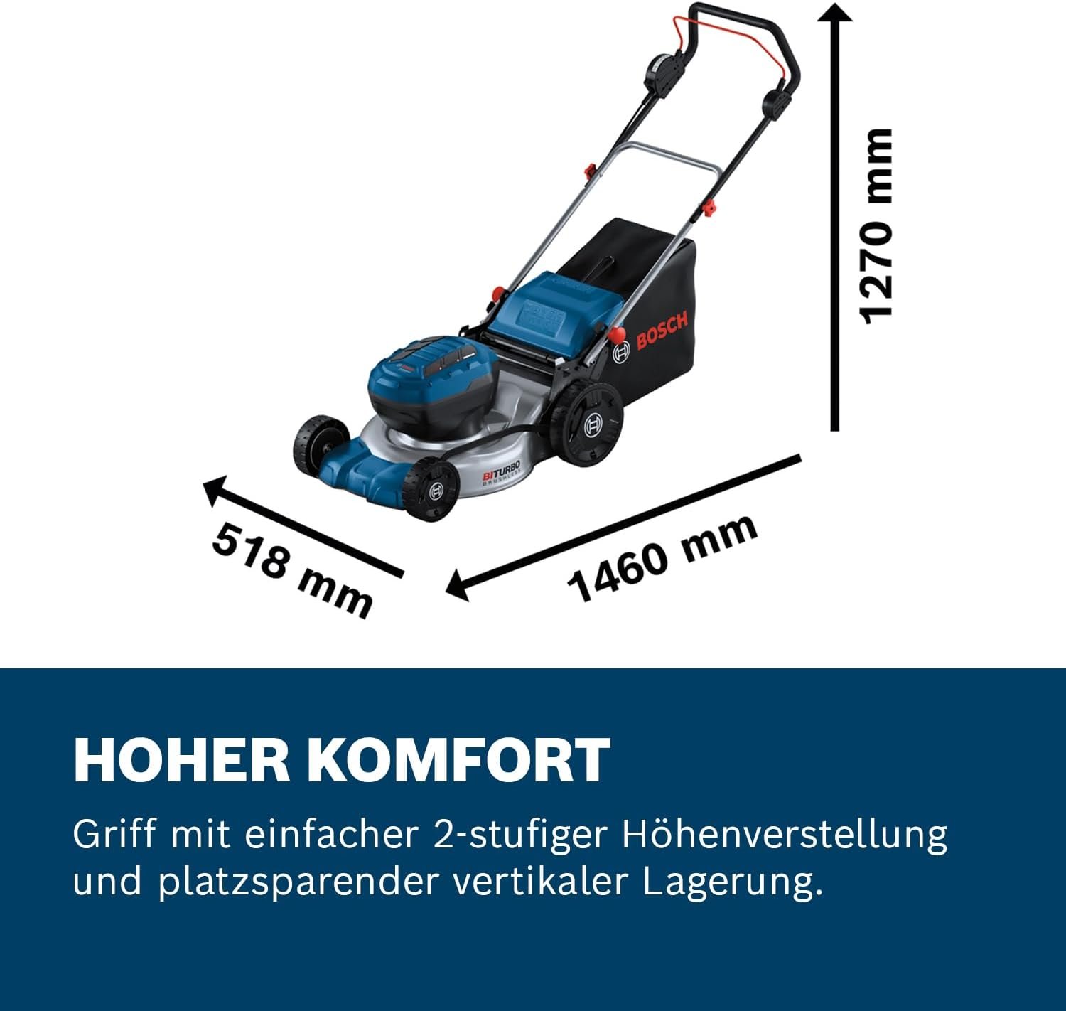 Hoher Bedienkomfort: Die Schnittbreite von 46 cm sorgt für schnellen Arbeitsfortschritt. Der Handgriff lässt sich einfach in zwei Stufen in der Höhe verstellen, um ein ergonomisches Arbeiten zu garantieren.