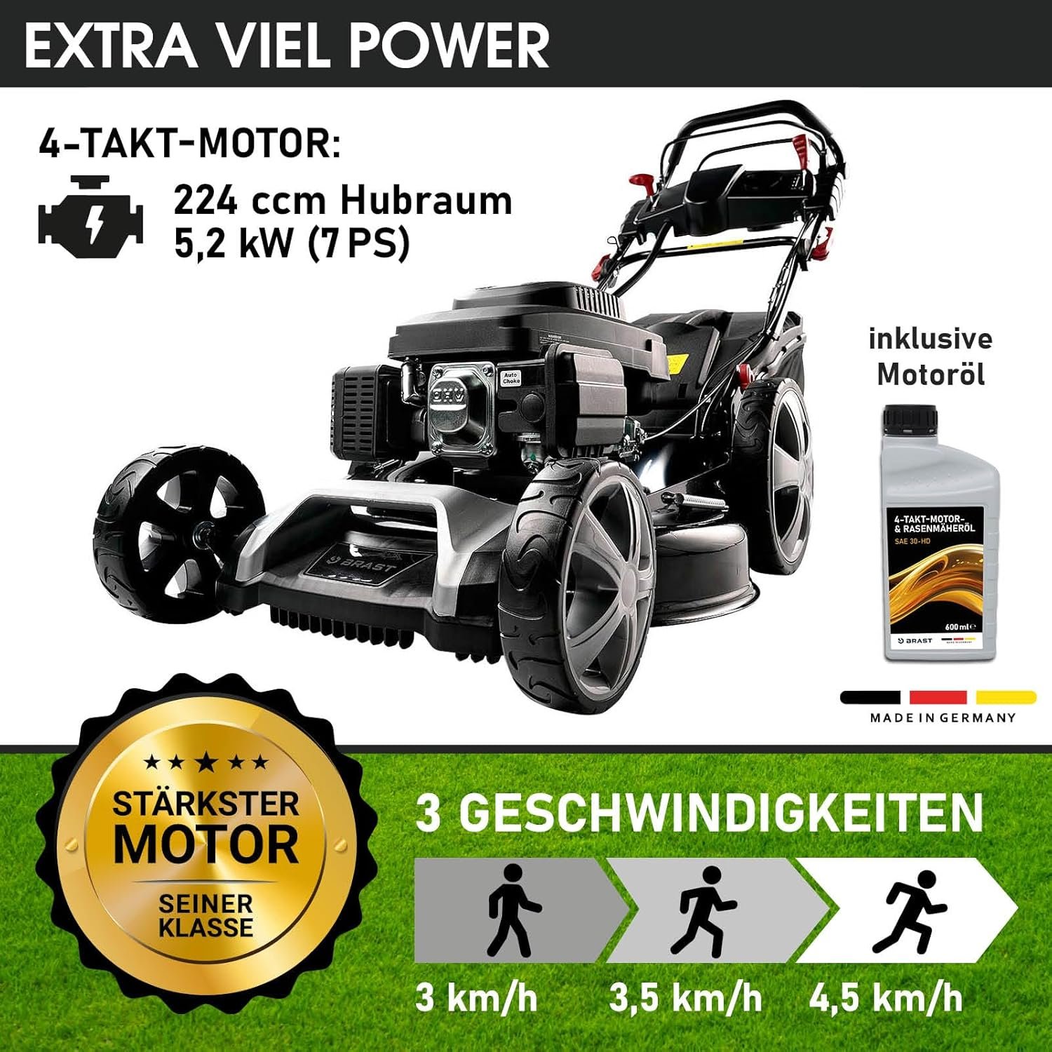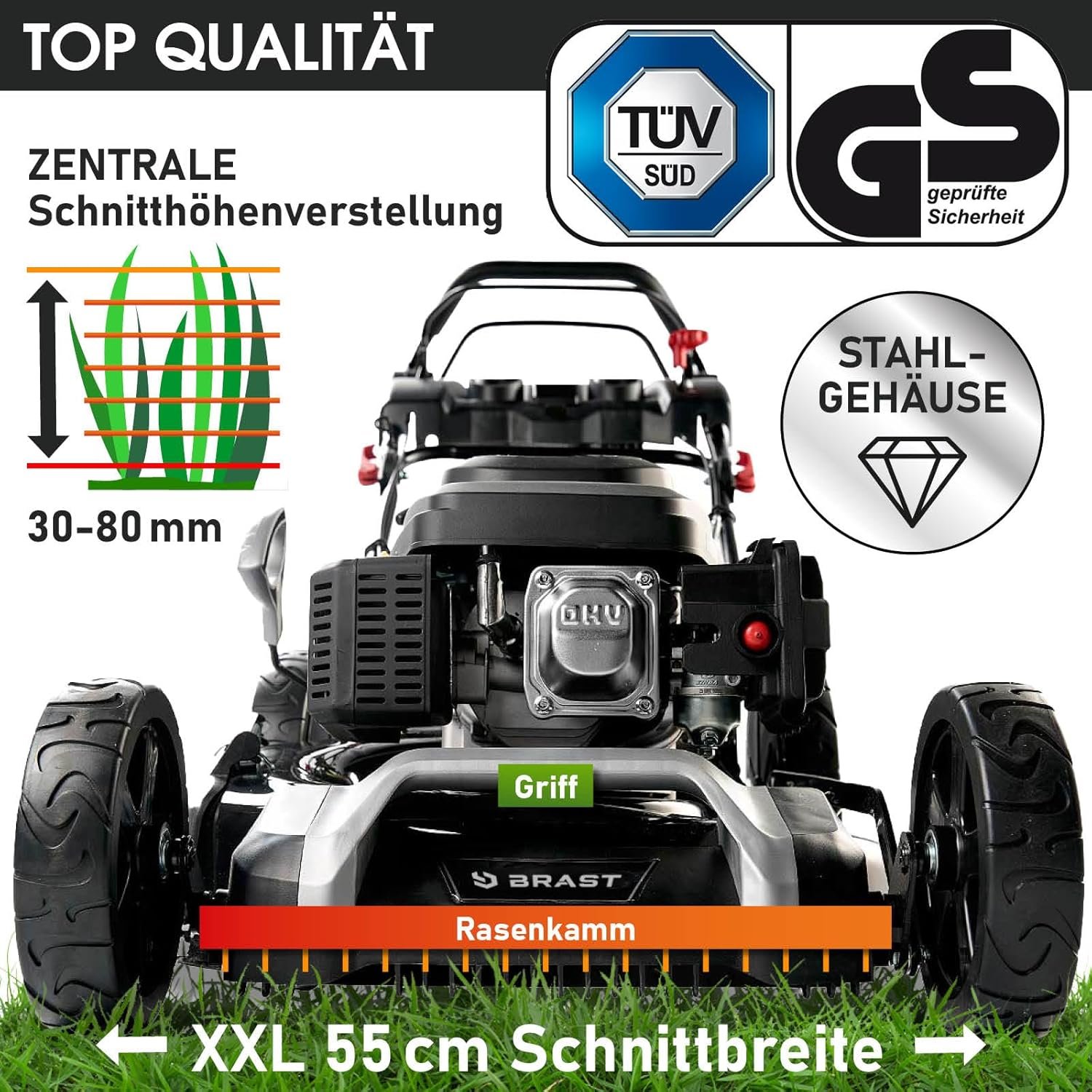 BRAST Benzin-Rasenmäher ESTART Speed: 5.2kW (7PS), 55cm Breite, Elektrostart, Radantrieb, 60L Fangkorb, Stahlgehäuse, TÜV
