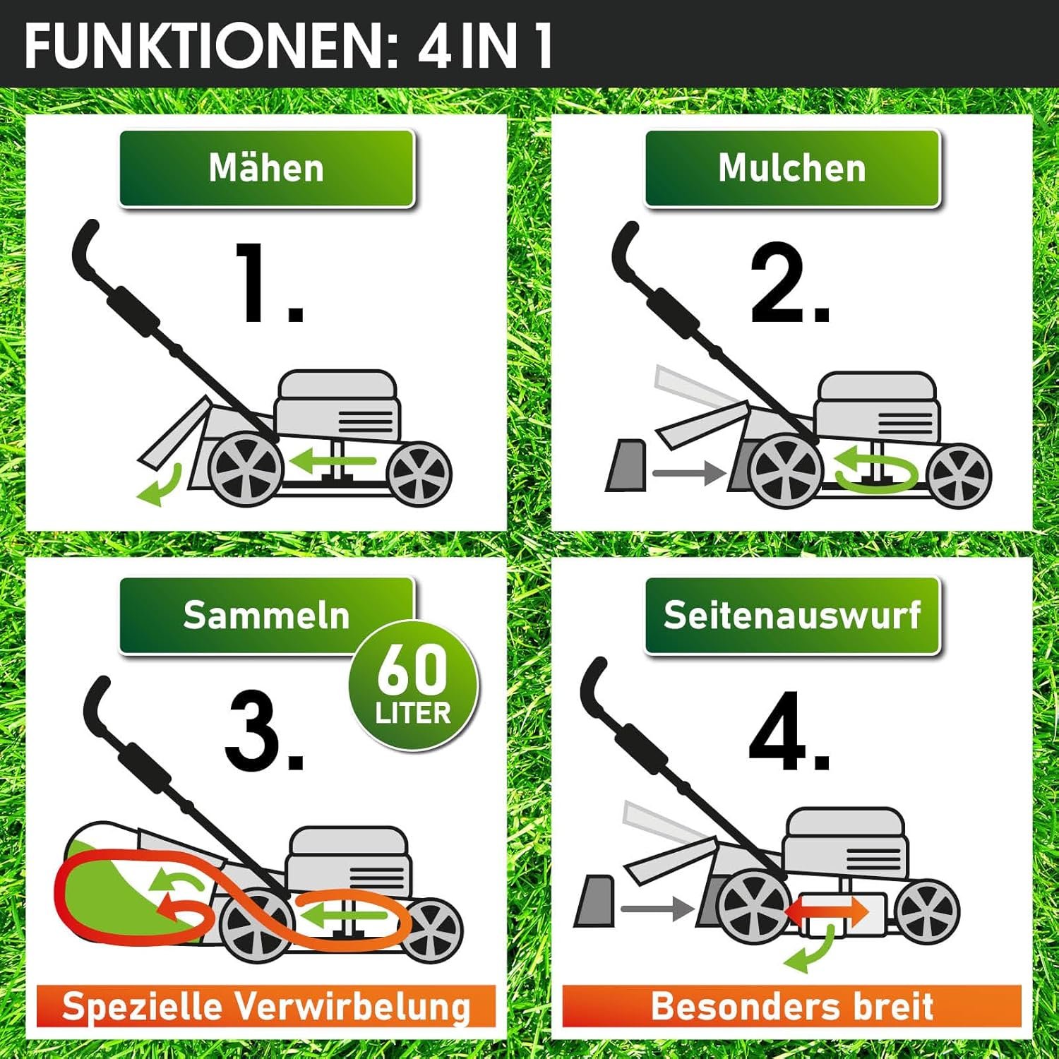4-in-1 Multitalent: Passen Sie die Pflege flexibel an: Ob klassisches Auffangen im riesigen 60-Liter-Grasfangsack, biologisches Mulchen, Mähen mit extrabreitem Seitenauswurf oder normaler Auswurf – dieses Gerät beherrscht jede Disziplin.