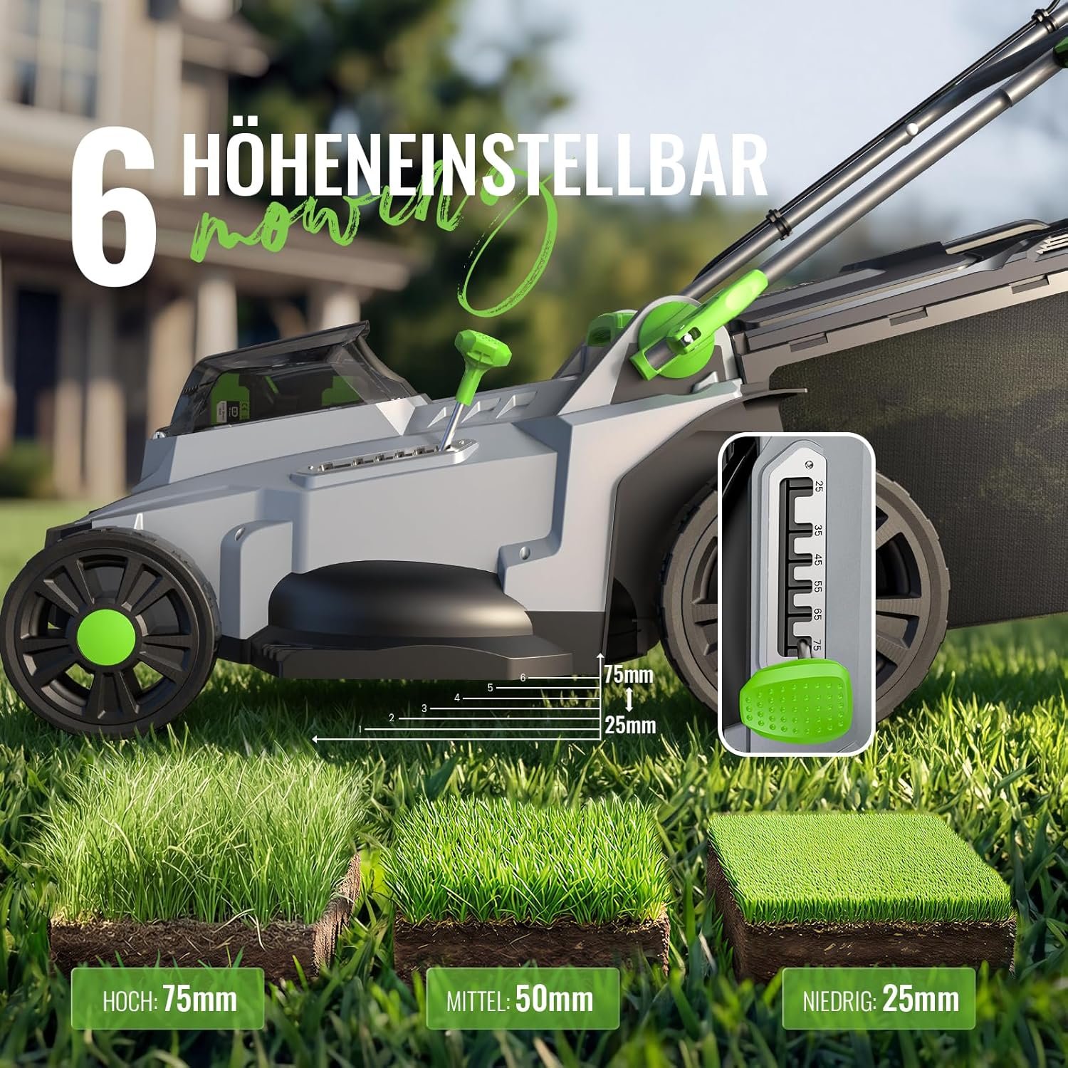 • Präzise Höhenanpassung: Die Schnitthöhe lässt sich bequem in 6 Stufen zwischen 25 mm und 75 mm variieren, um sich perfekt an jede Rasenbeschaffenheit und Jahreszeit anzupassen.
