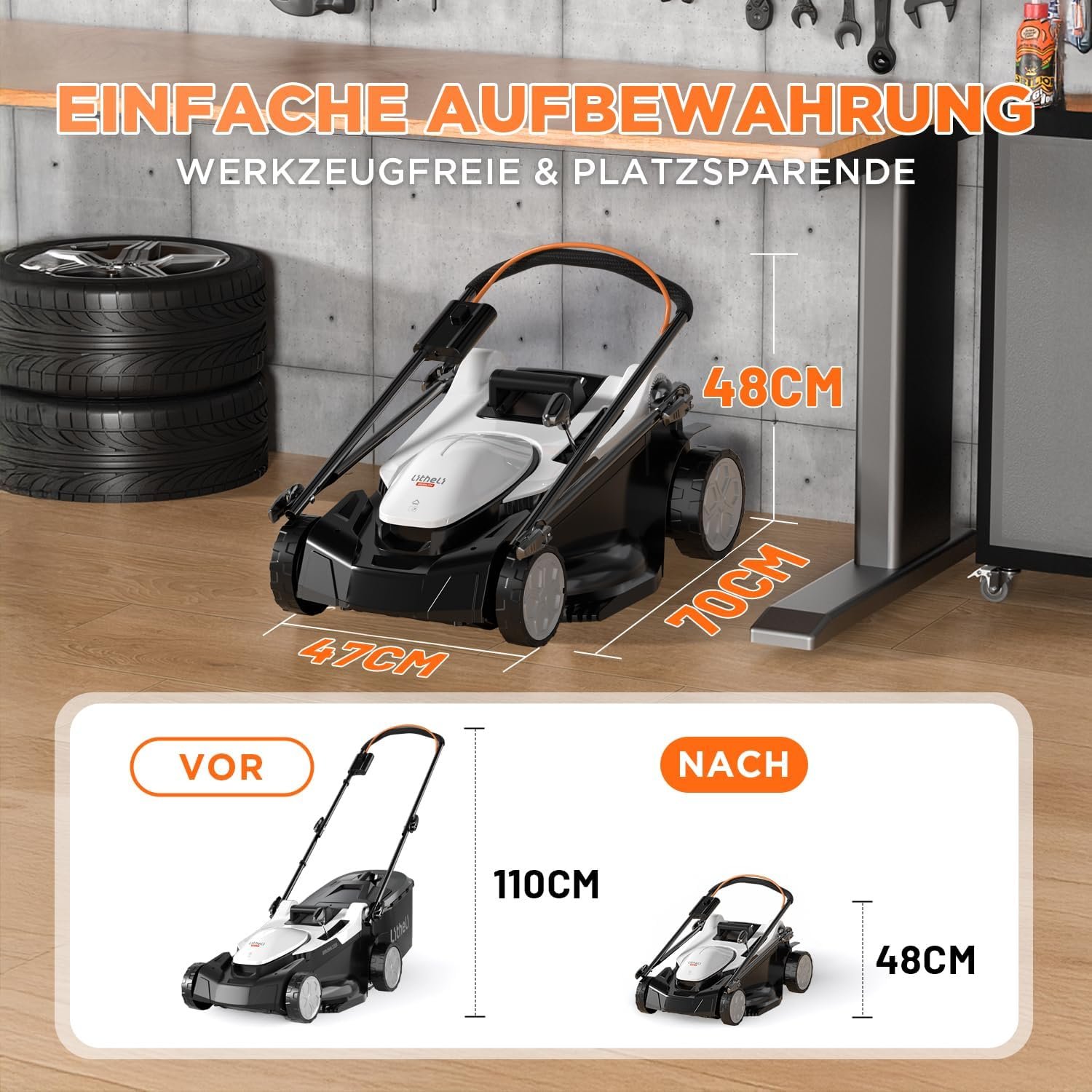 Ergonomisches Arbeiten: Der verstellbare Führungsholm schont Rücken und Arme. Nach getaner Arbeit lässt sich der Mäher dank des klappbaren Griffs und des praktischen Tragegriffs extrem platzsparend verstauen und leicht transportieren.