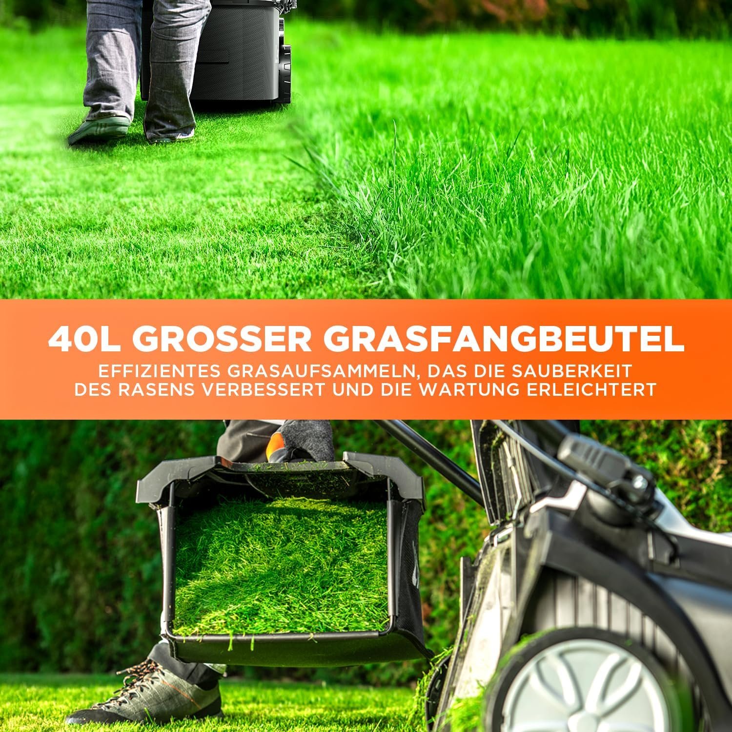 Großes Fangvolumen: Der 40-Liter-Grasfangkorb sammelt das Schnittgut effizient ein, sodass Sie seltener Pausen zum Entleeren einlegen müssen.